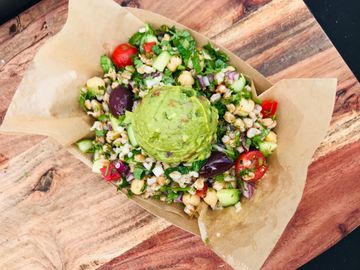 Garbanzo, farro, cherry tomato, red onion, black olives, cucumber, fresh herbs served with lemon vinegar dressing and guacamole.