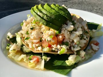 Cauliflower, tomato, cucumber, jalapeño, cilantro, spices, avocado.