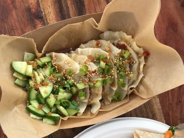 Hand made mushroom pierogi with cucumber salad and asian dressing.